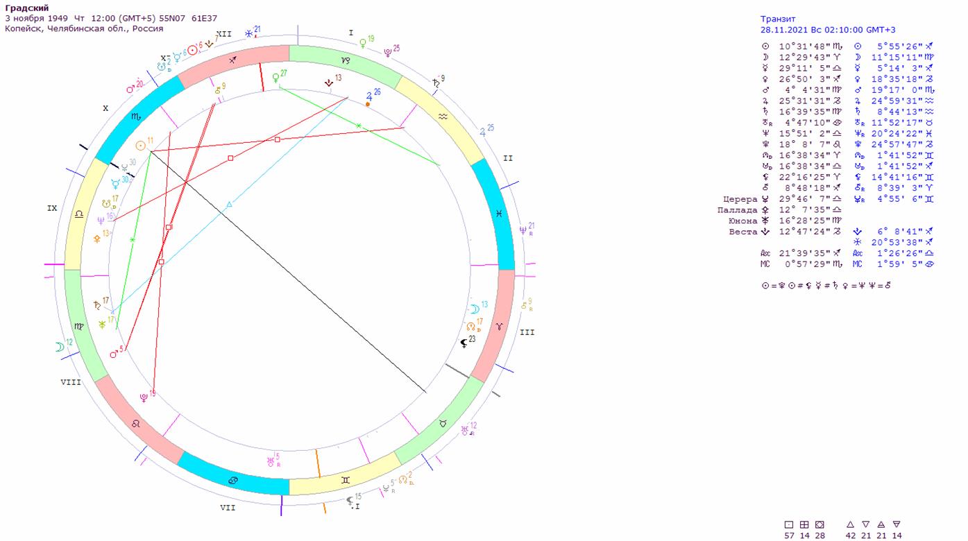 Смерть наступила в 28.11.2001 в 2-10 от инсульта (ослабленным организмом Градского после перенесенного ковида в сентябре). Транз. Уран ныне против его Солнца, ярко отражает тему инсульта, также сходящийся квадрат Сатурна к его Солнцу это усиливал, тем более Сатурн стоит ныне на его Психеи, т.е. напряжение психики (в том числе на проекте Голос) в это время было фатально. Обострение внес и Марс, недавно прошедший по его Солнцу, а ныне ударивший по его Плутону квадратом (и полутораквад. по его Урану), а в день инсульта и Солнце встало квадратом к его Марсу, также марсианские аспекты в принципе резонансны всегда были и с его Луной-ЧЛ, стоящих в марсианском Овне. Как горел на сцене и в жизни, так и сгорел, можно сказать на работе, исполняя своё призвание.
