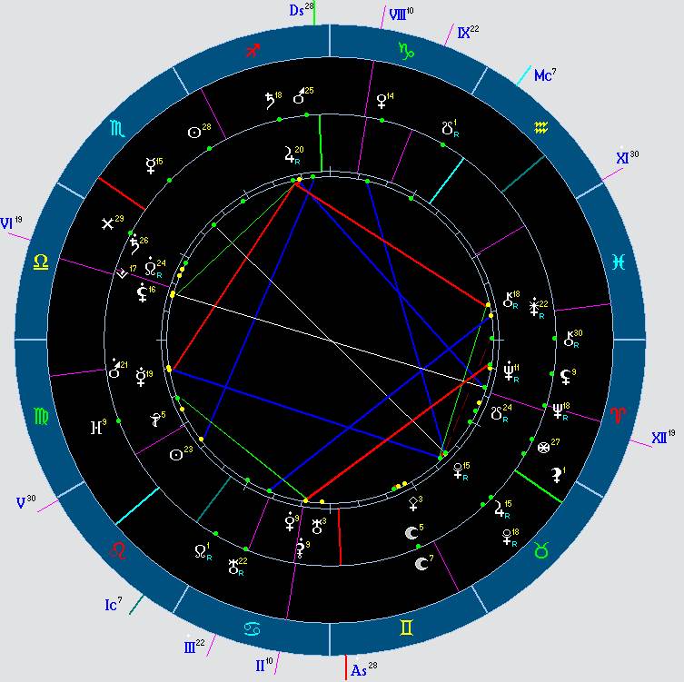 Если мы их Луны совмещаем, то Асц Мереж. попадает в самый конец Близнецов с Ураном в Раке и в целом в 1 дом этого лунного знака, а у Гипп. Асц в начале Скорпиона с Солнцем в 1 доме, как образ лидера специфического салона. Кроме Урана и 1 дома у Мереж. еще и Венера в Раке на которой астер. Меланхолия, что отражает частую мрачноватую грусть его лирики.