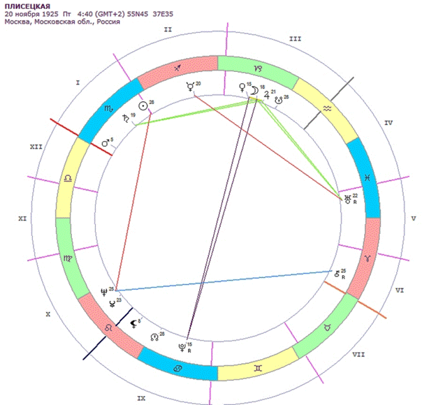 Гороскоп Майи Плисецкой (20.11.1925 Мск) -- это пример яркого и при этом строгого стиля Скорпиона с акцентированным Козерогом, где сочетается пронзительная пластичность и виртуозная концентрация эмоциональной энергии.