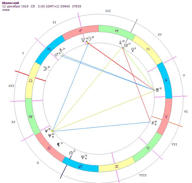 При этом наиболее аспектированным в космограмме получается Уран, на котором еще оказывается и астероид, связанный с фамилией Шаинского, – Шайна (данный в честь фамилии Шайн, происходящей от еврейского «шаи» (подарок), как и фамилия Шаинский).