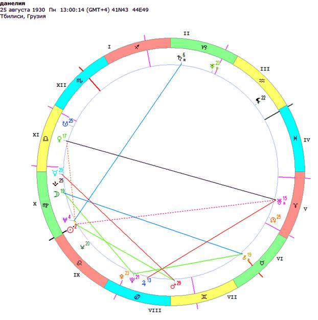 Но еще интересны эти планеты САТУРН в Коз. и ПЛУТОН (а также Юпитер почти против Сатурна в Коз.) в Раке тем, что они затрагивают тему национальности и патриотизма. И вот Данелия нам дает позитивный пример решения этой темы -- и патриотично и интернационально одновременно. Так в фильме «Не горюй» - яркая любовь к своему нац. характеру, но и здесь хорошие эпизоды дружбы с русским солдатом (Леонов) и с турком (Мкртчян) в тюрьме, а фильм «МИМИНО», вообще можно назвать пособием по интернационализму (фильм снят когда Плутон делал квадрат к его Юпитеру в Раке). Этому помогал в натале и аст. Толеранция на его Луне, которая еще и в тригоне с дипломатичным Хироном, при том, что его нац. астер. Картвелия (Грузия) у него в патриотичном Раке. В «Мимино» оба персонажа актеры-Раки демонстрируют свои нац. приоритеты, но личные человечные отношения их перекрывают, также и фильм «Паспорт» затрагивающий еврейский вопрос с человеческой стороны. Данелия сильно переживал конфликт России и Грузии в 2008 – его слова «лучше бы я до этого не дожил».