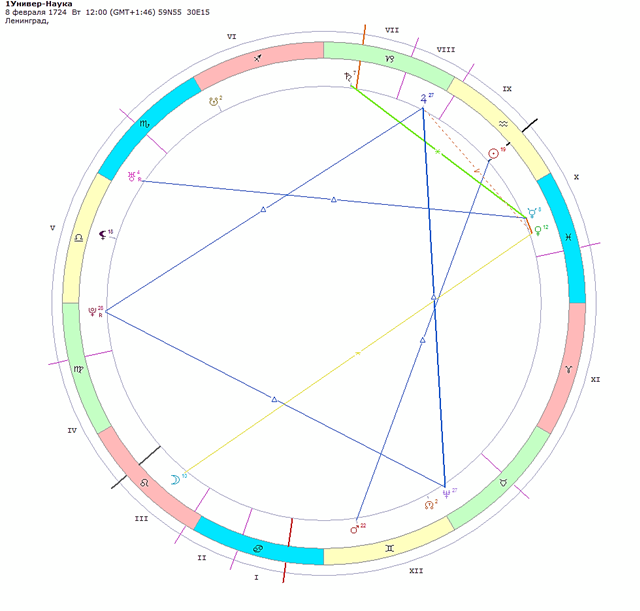 Интересно, что на Солнце Науки стоит астероид Шумахер, а именно в это время Академию наук России возглавлял ее первый президент И.Шумахер и Университет назывался тогда академическим, т.е был при Академии наук. Поэтому неудивительно что Солнце Науки в точном тригоне с аст. Академия, а на самом Солнце аст. Эдукация (образование), а еще Утопия, ориентирующая на мечту, кажущиеся (как раз без науки) несбыточной.