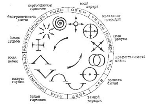 Рассмотрим теперь диаграмму развития мифологических представлений. Символы знаков Зодиака на диаграмме отражают идеи мифологического сознания.