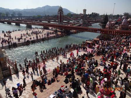 Я торопилась в банк, где меняли деньги только до пол-второго, и мы вышли раньше, у моста Рам-джюлла. Сияна в банк ехать не захотела и села сушиться, а я поймала рикшу и убедилась, что меняли только 100 евро на человека по паспорту – Сияна не поехала зря. За время ожидания она стала выбирать шмотки, и я повела ее в другому мосту Лакшман-джюлла, чтобы купить также сумку (Рама и Лакшман – братья, поддерживавшие друг друга в отшельничестве, и Ришикеш, некогда город отшельников, сохранил эту легенду). Из храма Ганги на высоте сотни метров мы посмотрели панораму изгиба реки, где меж белесых валунов качались на светлозелёных бурунах порогов разноцветные резиновые лодки. Мне тяжело было ориентироваться в яркости многообразных тряпочек, и мы застревали в каждом магазинчике, так что пропустили даже пуджу, которая у главного ашрама была в 5, а не в 6.30, как нам сказали (может в 6.30 была в другом месте), и вечернюю медитацию в ашраме.
