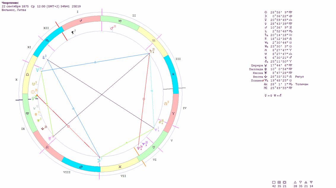 Развитию же музыкальных способностей помогла оппозиция Нептуна с Юпитером (где стоит аст. Литва и рядом астероид Чюрленис, что символизирует его известность на родине). Также вероятный секстиль Луны к Нептуну и соединение в единой связке трех музыкальных астероидов - Эвтерпа (пение), Гармония и Флагсимфония (значимое созвучие) в аспекте к его Солнцу. Эмоциональному слиянию с музыкой давала связка Пасасимфонии (страстное созвучие) и Бахуса (опьянение, музыкой в том числе), а на новое отражение музыки (через живопись) подталкивал первооткрыватель аст.Прометей, стоящий у него на планете музыки -Нептуне у него Прометей (например. картина «Соната звезд»,приведенная здесь).