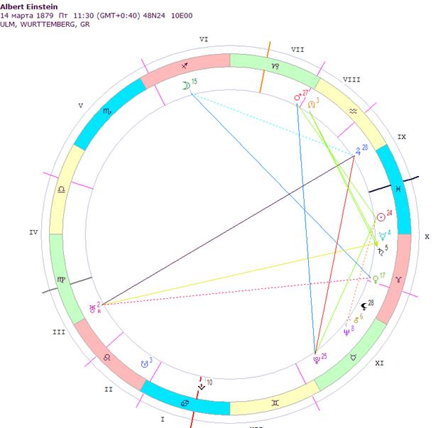 На его связке Меркурий-Сатурн – аст.Карма, т.е: предназначение в познании законов времени и это повторяет связка на его МС – Эдукация(образование)-Фанатика-Опс(труд)-Ата(одержимость). Эйнштейн считал, что добиться в научном открытии можно только фанатично отдавшись познанию, что и подтверждает эта связка в Зените.