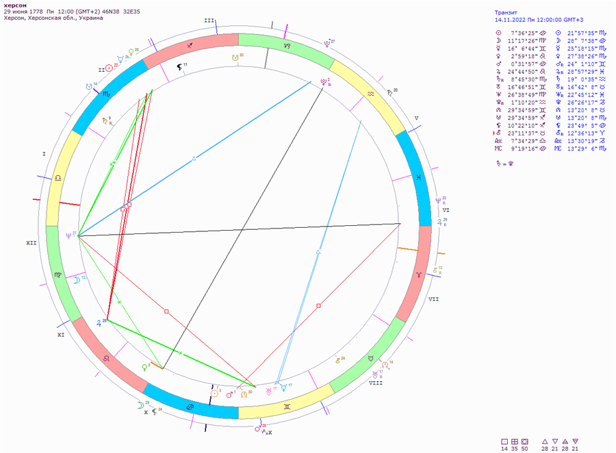 Замечу при оставлении Совет. армией Херсона в 1941 Солнце было на Юпитере Херсона, а Нептун был на Нептуне города. Т.е эти казалось бы гармонич. аспекты, как не странно, связаны с его оставлением советскими и российскими войсками.