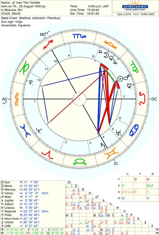 А жестокость Грозного – отражает точное соед. Солнце-Марс в квадрате с Сатурном, что и дало диктатора (кстати, у Сталина тоже Солнце квадрат Сатурн при Марсе против Плутона, при этом, что удивительно! у обоих Луна в Весах, т.е. эмоц. зависимость от партнёра или противника, особенно у Грозного если его Солнце-Марс в 7 д.). Характерно, что у Сталина рядом с его Марсом стоял в натале астероид Грозный.
