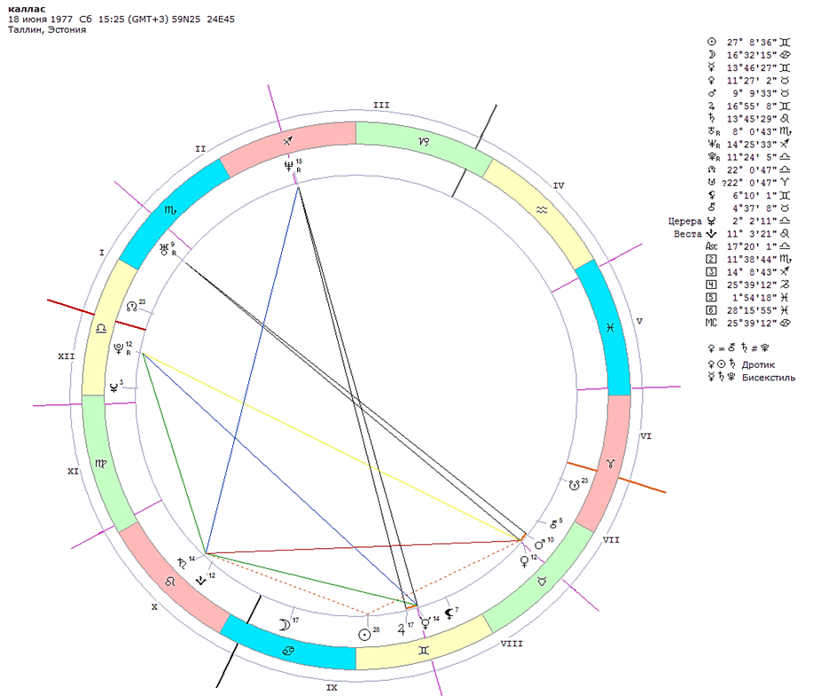 У Каи Каллас Луна в Раке, значит, сильная эмоциональная связь со своим родом, откуда и накопилась такая русофобия от наследия её дедов, помогавших фашистскому режиму против советской России и наказанных за это высылкой, а жёсткость, вероятно, от ливонско-немецких корней. Тем более в карте бисекстиль, включающий наследственные планеты по крови – Плутон (вероятно, в квадрате с Луной), и по духу рода – Сатурн (на котором огонь памяти и мщения усиливает пылающий астероид Веста), а также в этом бисекстиле – Меркурий в знаке её Солнца.