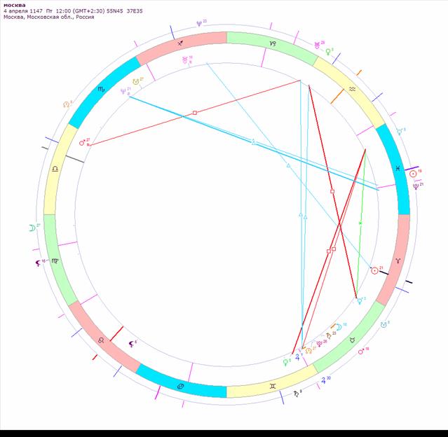Характерно, что в год рождения Юрия Долгорукого Уран был в том же мессте где и Уран митрополита Петра (15-16 Овна), т.е рядом с Солнцем Москвы (21 Овна) и Плутоном Руси (17-19 Овна).