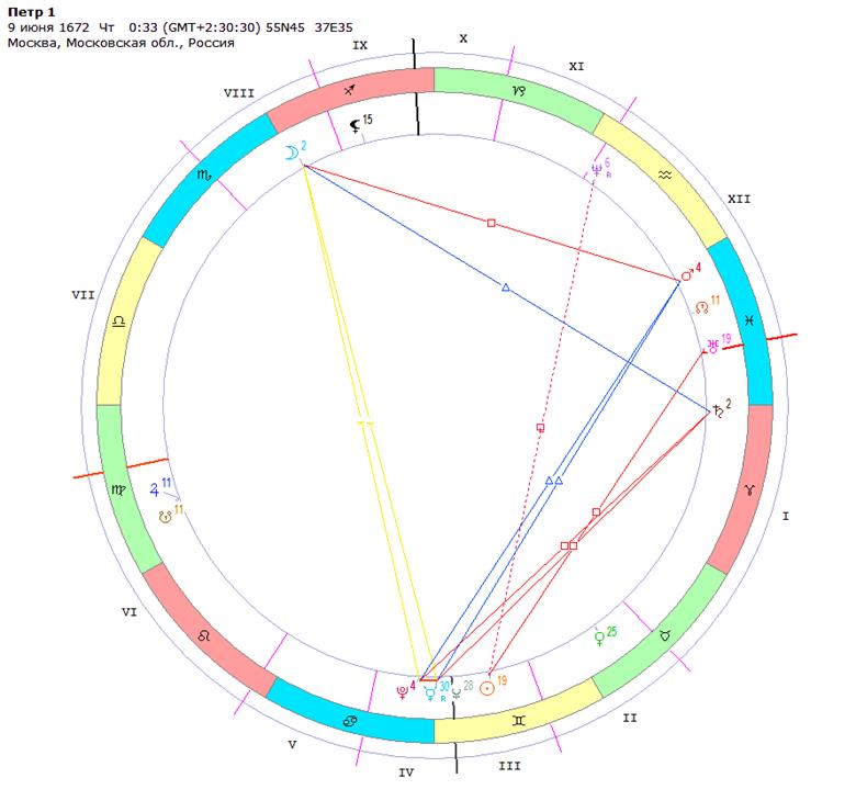 Интересны здесь и приведенные точные даты из жизни Петра: «…день, когда началось обучение Петра, - 12 марта 1677 г., следовательно, Петру не исполнилось и пяти лет» – именно в этот день (30 марта по н.с) транз. Юпитер в Водолее встал в точный до минут тригон к Солнцу Петра.