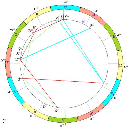 Веру в свою победу помимо усиленного Марса Плутоном давали астер.Фидес (вера) и Ника (победа) на его Марсе, а одержимость своих идей помимо Урана в секстилях от Юпитера и Солнца еще связка в Овне: Ата-Веритас (безумие-истина), стоящая в боевом квадрате с Плутоном, и также в Овне связка, Психея-Сехмет («психоз истребления», Сехмет – егип.богиня-львица, которой ее отец бог Ра поручил наказать людей за грехи, но она настолько вошла в азарт истребления людей, напиваясь их кровью, что боги с трудом ее остановили, подменив кровь пивом с красной охрой). Последняя связка с Психеей была в квадрате с Дике (справедливостью), т.е его психика заходилась и теряла здравый смысл и реальность справедливости, ради которой, казалось бы и проводились чистки.