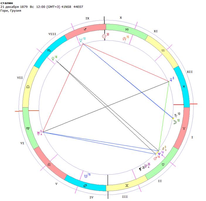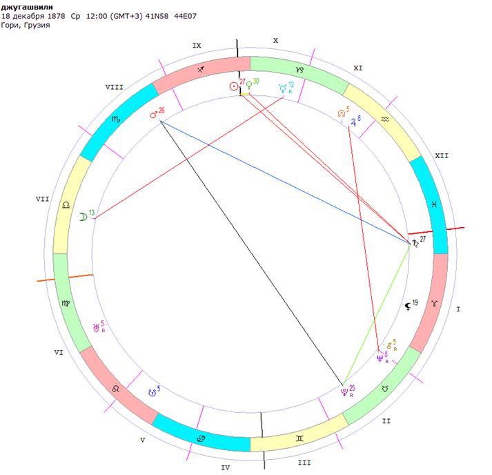 Есть мнение, что на изменение ДР Сталина повлияло его общение с эзотериком Гурджиевым, хотя, может, и сам Сталин, почувствовал в начале 20 годов (когда новая дата появилась в офиц. документа) недостаточную лидерскую силу своей природы от рождения, при этом имея сильные внутренние амбиции (пораженные Юпитер, Марс и Сатурн) настроился на иной образ, который и интуитивно синхронизировался в выборе новой офиц. даты его ДР, тем более она своими самыми яркими аспектами резонировала с настоящими лидерами революции, с которыми Сталин был рядом, но еще в их тени – Лениным и Троцким.