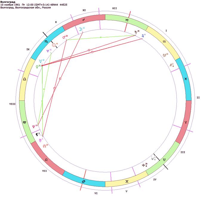 Карта на переименование в Волгоград (10.11.1961) уже по традиции двух прежних имен имеет квадрат на Юпитер – теперь от Мерк. с Венерой, что скорее указывает на ослабление имиджа, также как и Уран против Хирона (как и у Степашина) и в квадрате от Марса, еще и Лилит на Уране, что характерно для прошлых карт имен (где тоже Лилит отмечена, она на Нептуне Царицына, который также в квадрате от Марса), и это далее подразумевает некую неустойчивость нынешнего имени, что собственно и отразилось в нынешнем предложении о его смене. Тем более Юпитер Волгограда в полуградусе Водолея, куда уже в апреле придет Плутон, что как раз может внести новые импульс обращения к трансформации образа и энергетики города, тем более Уран сейчас против Солнца Волгограда, а Сатурн идет к оппозиции к Урану Волгограда. Вот его нынешнее имя и зашаталось, хоть это имя и звучит по водолейски, но транз. Нептун создающий секстиль к Сатурну Волгограда настраивает на обновление фундамента в нынешней турбулентности жизни. А имя Сталинград более устойчивое и стержневое.