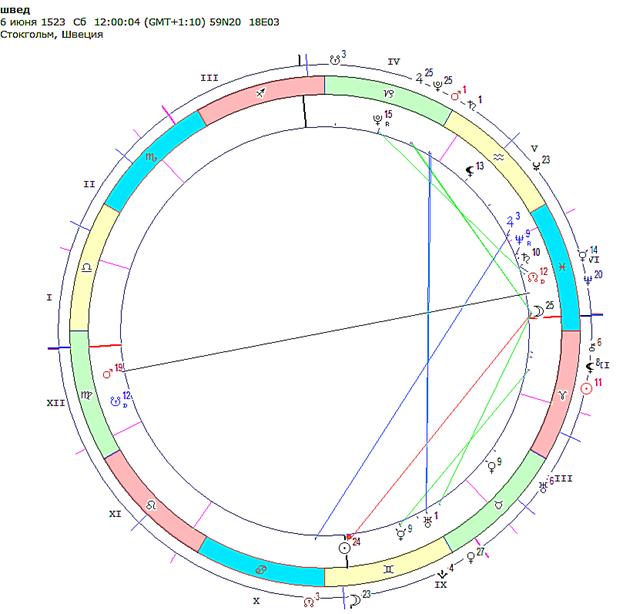 Аспект соединения Сатурн-Нептун оказался в карте страны, вероятно, архетипичным для шведской нации, так как позже он был отражен и в карте шведской Конституции (6.6.1809), а также он оставил след на территориях и народах, входившие ранее в Швецию. Так, все карты государственности Финляндии имеют этот же аспект соединения Сатурн-Нептун (1595 – герцогство Финляндия в Швеции, 1809 – автономия вел.княжества Финляндского в России, и 1917 – независимость республики Финляндия). Такой же аспект в карте независимости Эстонии (1918 г), также бывшей ранее под шведами. Правда, все эти соединения в картах данных стран были в знаках огня (а не Рыб), также как и у наследника шведского города в дельте Невы – нашего Санкт-Петербурга, в карте которого тоже соединение Сатурн-Нептун (в 1703 г. в Овне).