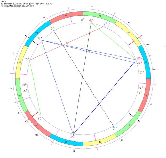 В карте СССР самая сильная конфигурация – это водный трин между связкой Марс+Уран с Юпитером и Плутоном, при этом этот трин был завязан на Солнце – бисекстилем от Марс+Урана с Юпитером и оппозицией на Плутон. Все эти планеты играли особую роль для СССР. Поэтому транзиты к ним особо значимы.