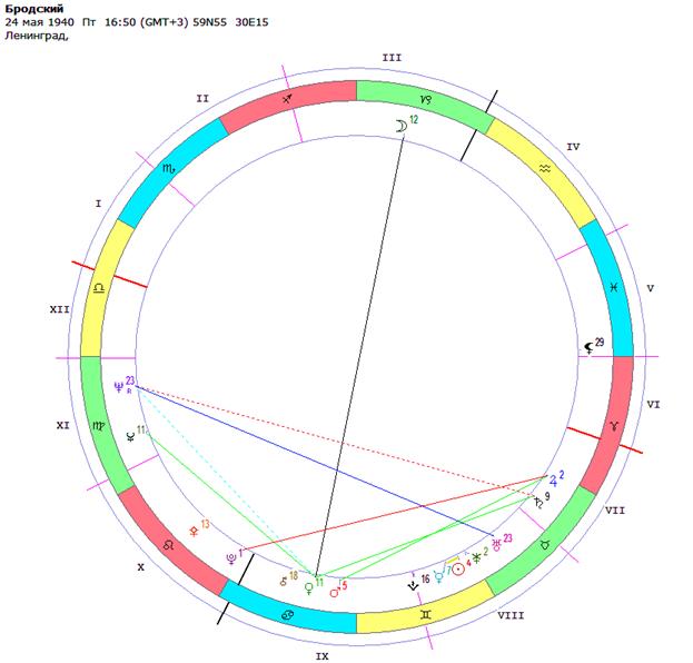 Самый яркий аспект гороскопа Бродского – точный мифопоэтический тригон Уран-Нептун (кстати, лежащий на искромётном тригоне Пушкина Меркурий-Уран), хотя обе эти планеты Бродского в слабых положениях, с точки зрения резонанса их качеств с внешним психо-идейным фоном их проявления. Их положение в домах дало экстремальные перемены в жизни (Уран в 8 д.) и большой круг друзей, способствующей неформальной творческой реализации (Нептун в 11 д).