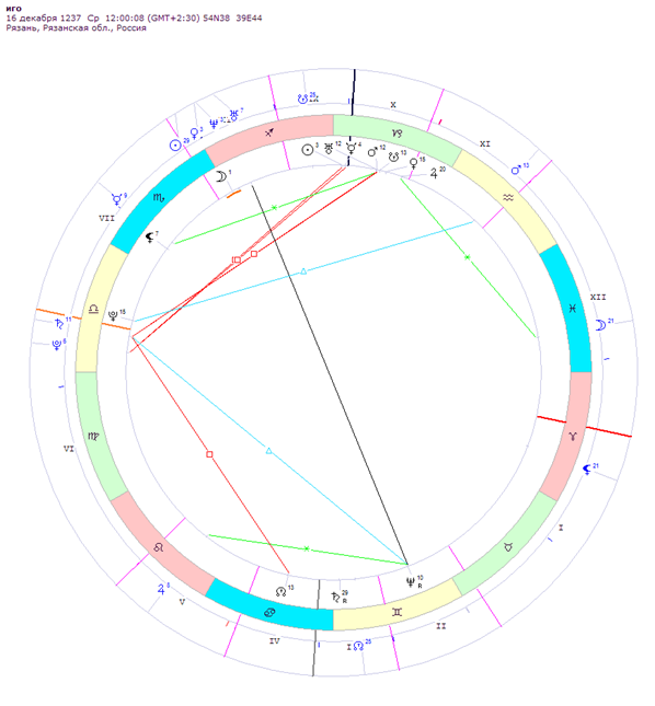 В натале Рязани 1095 г квадрат Урана (20-е гр Овна) с Нептуном (20-е гр. Рака) значит Юпитер штурма (20 гр Козер.) создавал тауквадрат с этим нат. квадратом города. Также у Рязани Плутон в Овне (в районе 8-10 гр Овна) , т.е Марс-Урана (12 Козер.) штурма давал квадрат к Плутону Рязани, да и Плутон штурма (15 Весов) близок к оппозиции с Плутоном Рязани, видно все это и притянуло несчастье к этому городу в первую очередь.