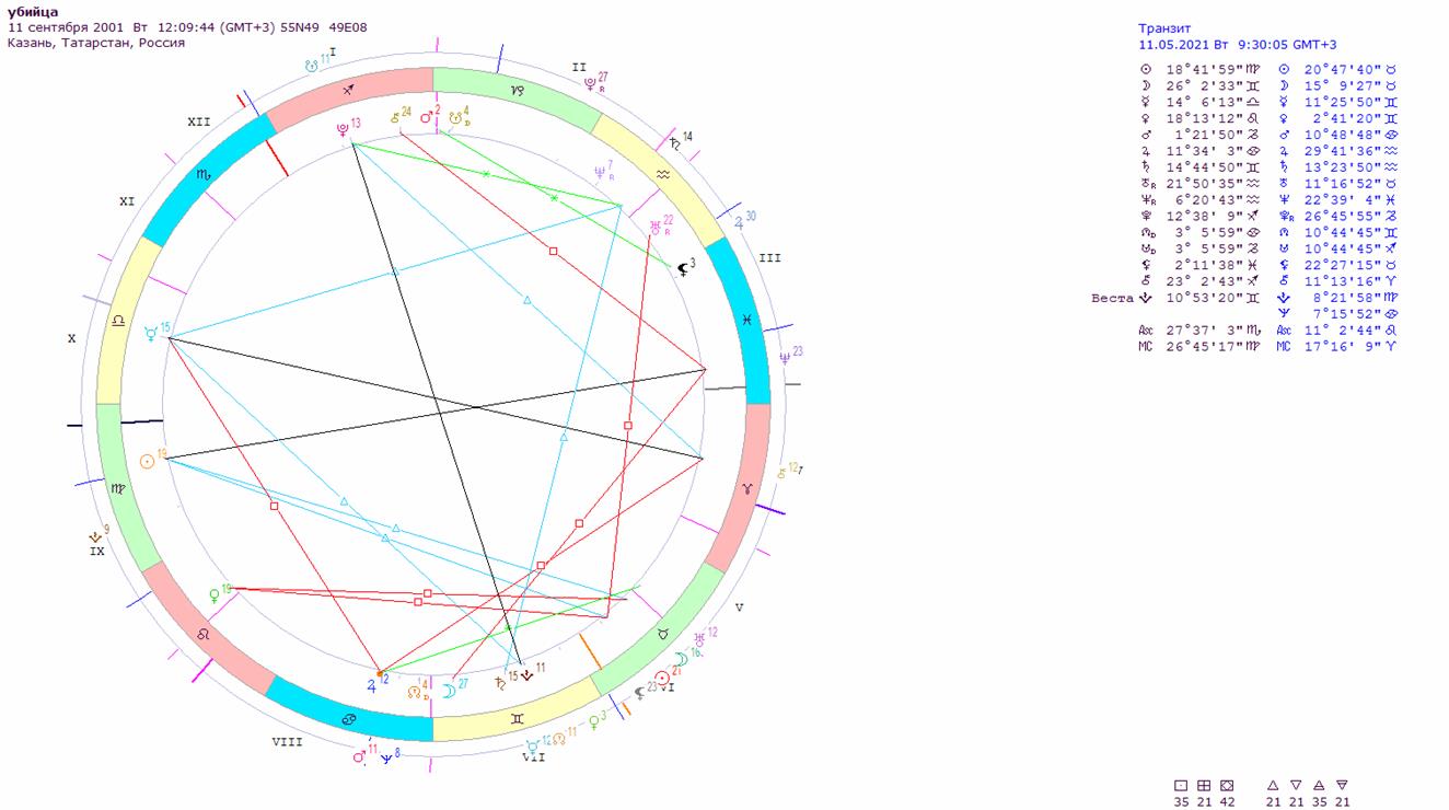 При нынешней казанской трагедии: транз. Солнце-ЧЛ были в квадрате к Урану убийцы. Нынешняя проблема между Ураном и Сатурном усилила его проблему с этими планетами.