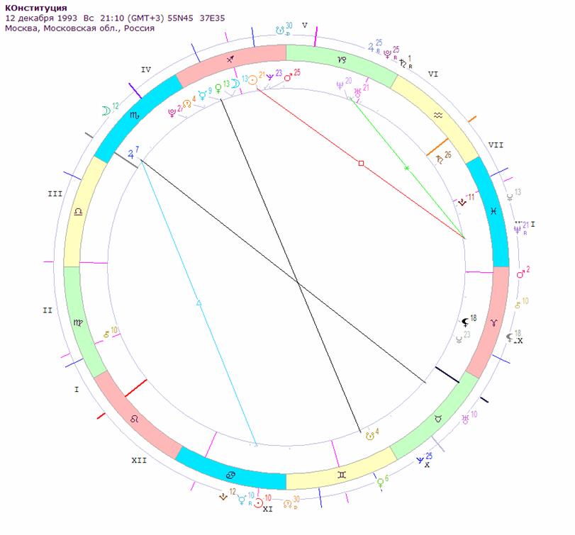 Надо заметить, что Солнце Конституции (12.12.1993) точно против Солнца РФ (12.6.1990), что сразу ставило ее в ущербное положение. Тем более, что конституция принималась при квадрате Сатурн-Плутон (а Плутон был еще и на Черной Луне РФ), и это предопределило ее разрушение (=изменение).