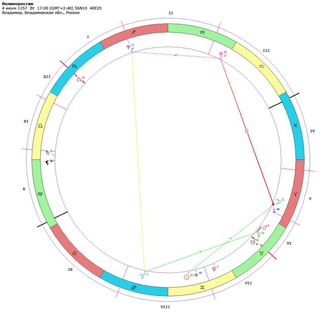 Ныне же внутренняя "матрешка" (Великороссии-РСФСР) надела на себя одежды внешней (России=СССР). И похоже в карте РФ карта Вел. проглядывает изнутри. - В обоих Солнце в Близнецах, на линию Узлов Вел. – попала оппозиция Венера-Плутон карты РФ, притом что в обоих картах Венеры в Тельце, на Уране Вел.- Сатурн РФ, на Мерк. Вел - Юпитер РФ, от Луны РФ тригон к Плутону Вел. и квадрат к Марсу Вел. и тд..