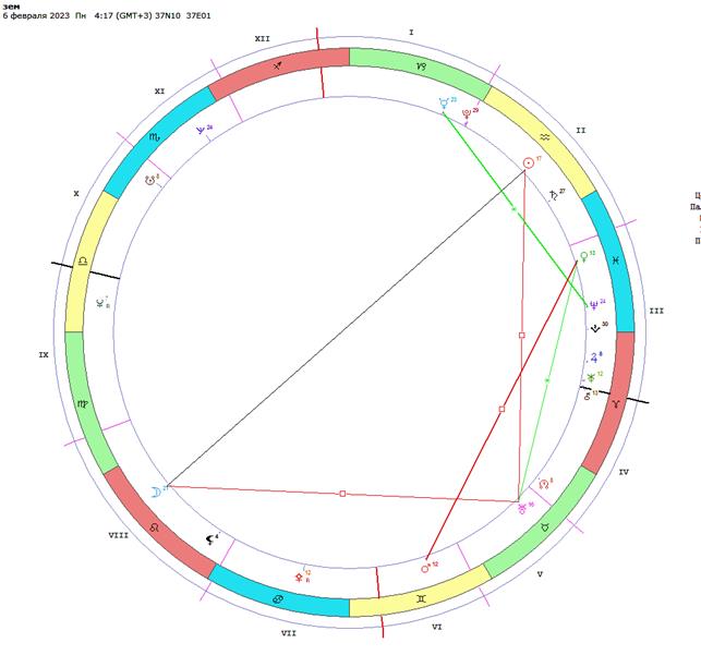 Что касается гороскопа Сирии, то там нет бесспорной офиц.даты в ее сложной истории современного гос-становления, но если взять дату фактической независимости, то это 17.4.1946, где натально Солнце квадрат Марс и Юпитер квадрат Сатурн, но характерно что Венера там же, где и у Турции, а на них ныне стоит транз.Уран, также тр.Плутон сейчас против Марса Сир., а тр.Юпитер против Нептуна Сир. – эти транзиты в принципе тоже могут соответствовать сегодняшнему событию для этой страны.