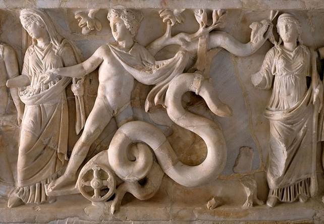 Там вот там среди окружения Деметры был Триптолем, бог посевов, распространявший земледелие по всему миру. Именно вчера (прямо в момент вхождения Солнца в Змееносец), мне стало интересно вновь обратиться к истокам этого божества. И вот оказалось, что основной сюжет об этом божестве описывает столкновение Трипотолема с Карнабоном.