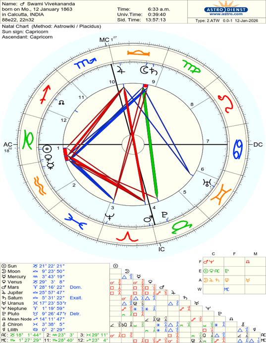 В гороскопе Вивекананды (12.1.1863) обращает на себя внимание оппозиция Нептуна (3 д.) в Овне – к Сатурну (9 д,): на котором стоит астероид Алетея ("истина") – в соединении с Луной в Весах. Эти полюса, выявляющие глубину разнесенности всеобщего и индивидуального, духовного (изначального - Нептун) и материального (созданного - Сатурн), объединяет Меркурий в соединении с Венерой в Водолее вблизи козероговского Солнца в 1 доме - что может символизировать альтруистическое распространение духовной информации по всему свету. Этому способствуют связки астероидов Бхагват с Вибилией (отъезд: «благотворное путешествие») и астероидов Талант-Америка на Юноне: талант Вивекананды раскрылся в Америке (а Юнона, кроме личной симпатии, даёт и благоприятное окружение).